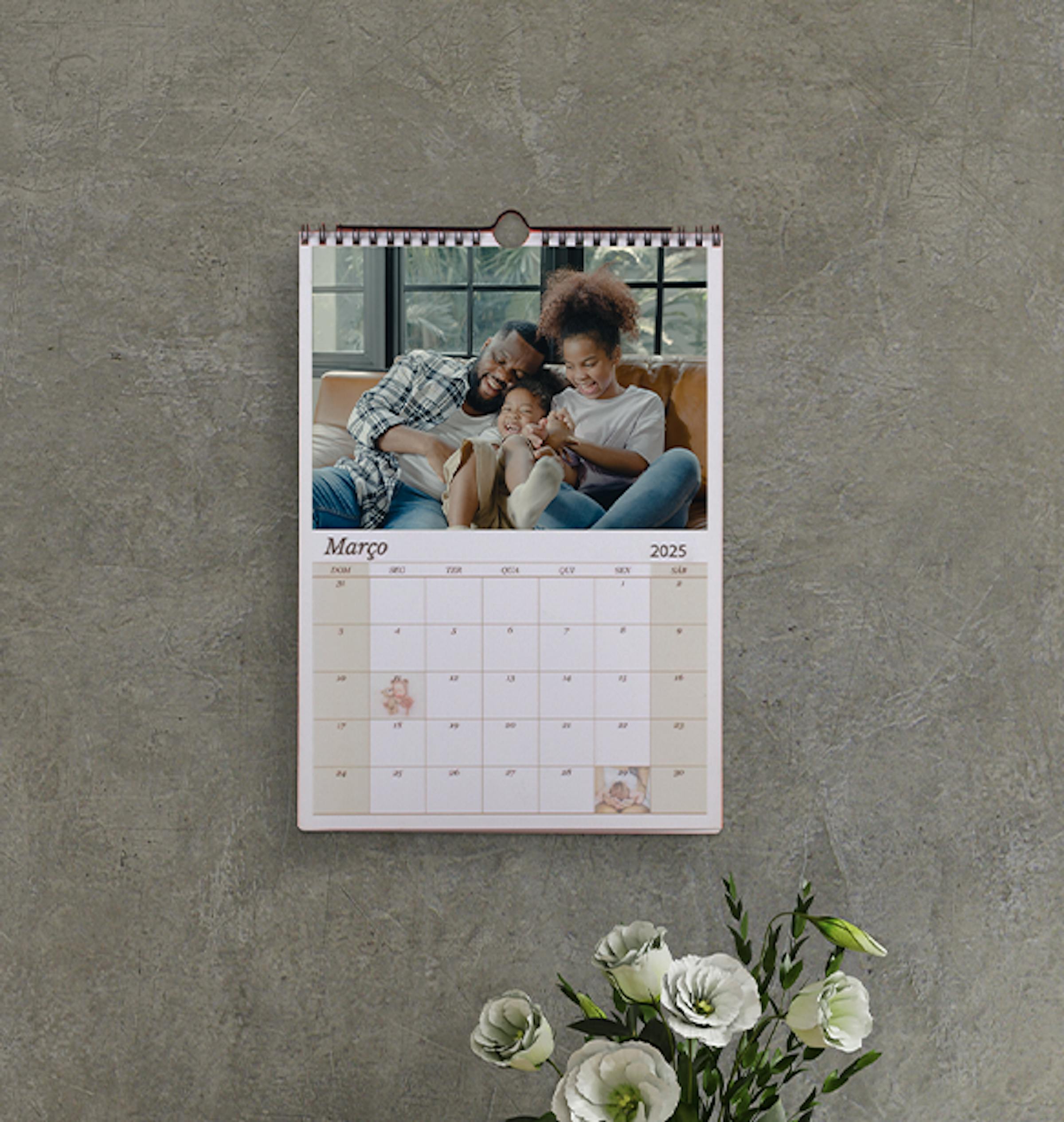 Sua casa precisa de um calendário de parede. Além de importante para organizar os seus compromissos, ele decora o ambiente com as suas melhores fotos. Você pode fazer o seu calendário de parede em dois tamanhos: Grande (29,7 x 21 cm) e o Extra Grande (42 x 29,7 cm). Ele é impresso em papel couché 250 g/m² e as folhas ficam presas com espiral wire-o. Você pode personalizar a capa e todos os meses do ano com fotos, fundos e enfeites. Você pode ainda marcar os aniversários e datas especiais personalizando os dias do seu calendário com fotos e textos. Crie o seu agora mesmo!