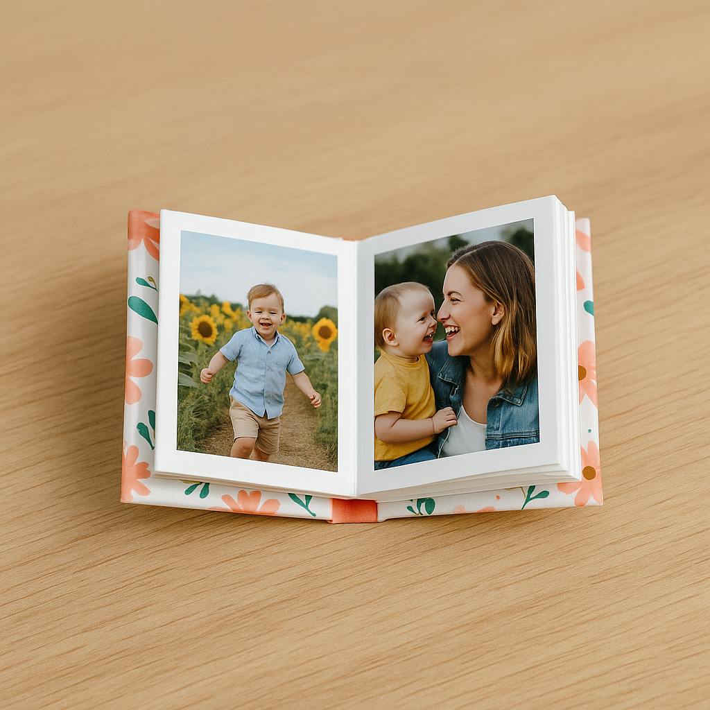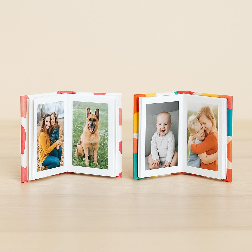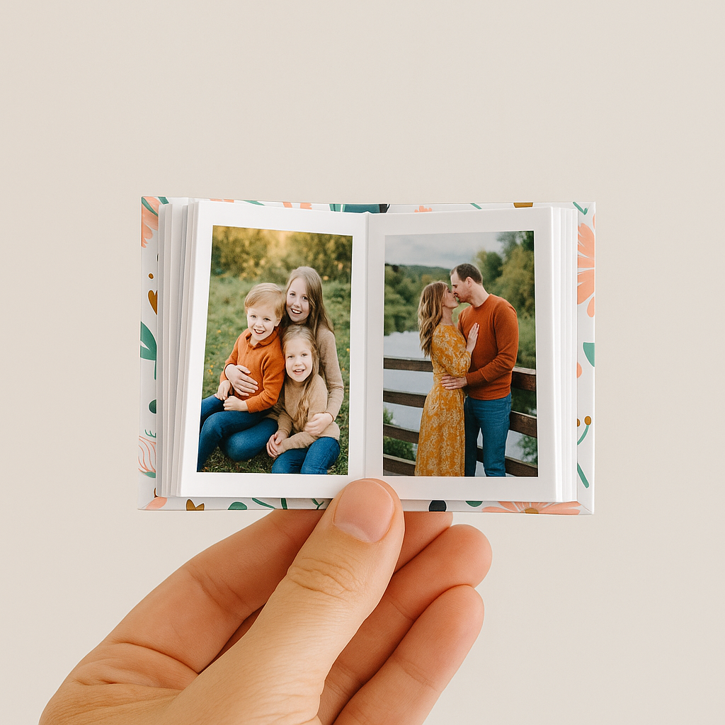 As fotos são impressas em papel fotográfico fosco de qualidade premium e montadas à mão em cada mini livro de capa dura.